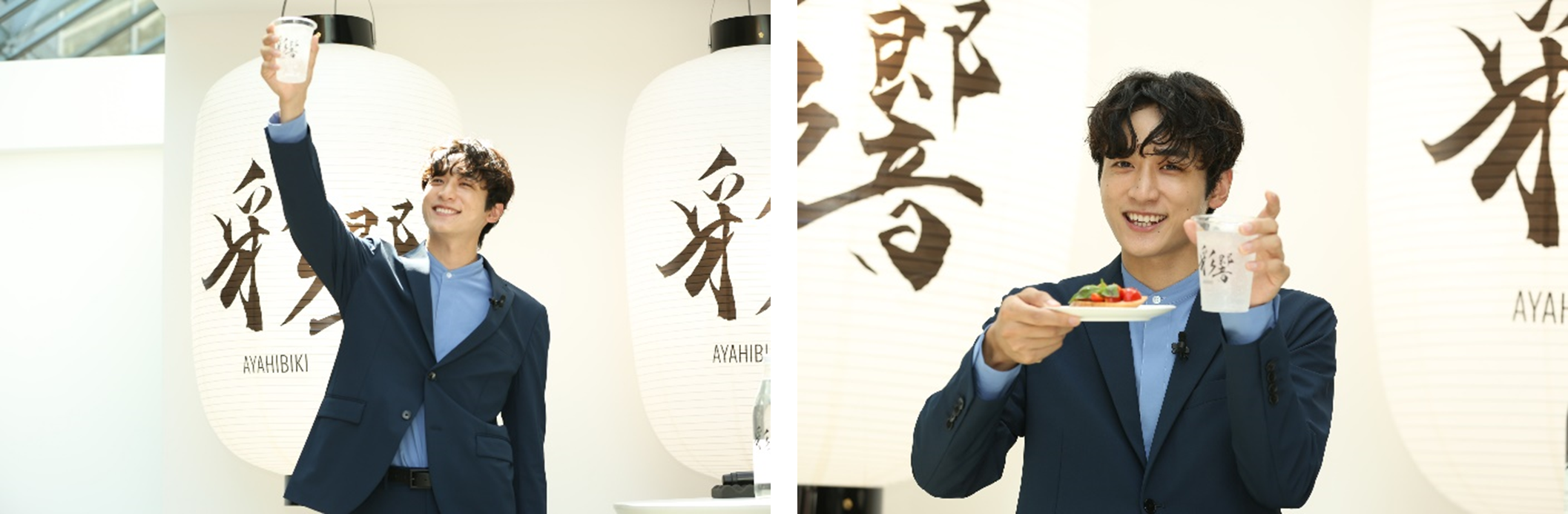 当日は若手注目俳優の小関裕太さんにご登壇いただき、氷グラスに入った彩響の炭酸割りを手に乾杯し、彩響の“未体験の冷涼感”を体感いただきました。