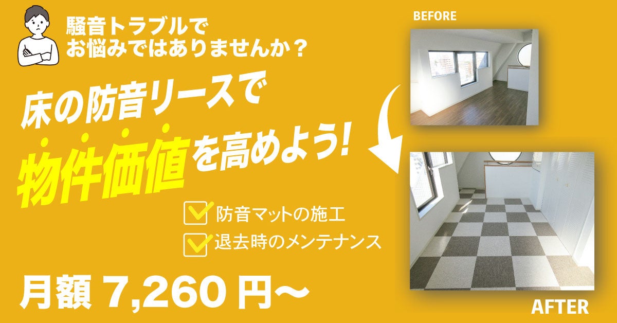 この度新たに展開する「防音マットリースサービス」は、騒音トラブルで悩みを抱える管理会社様や物件オーナー様に向けたサービスです。月額7,260円から同社で人気の防音マットをリース契約で利用することができるだけでなく、防音マットの施工から退去時のメンテナンス、契約終了時に使用済み商品の処分まで行います。
