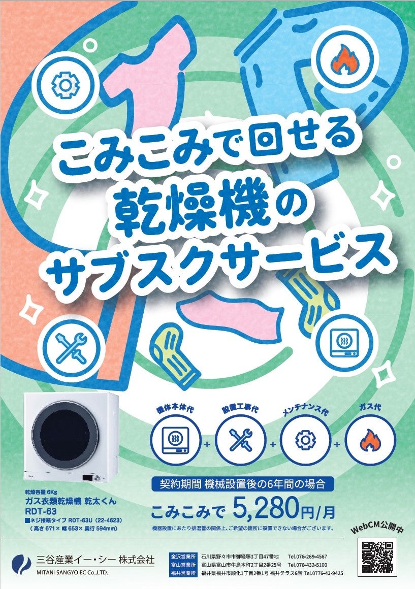 三谷産業イー・シーがLPガス販売を行う北陸エリア(※石川県、富山県、福井県の嶺北エリア)は、多雨多湿の日本海型気候に分類され、年間降水量の多い地域です。このため、洗濯にまつわる悩みを抱える家庭も少なくありません。三谷産業イー・シーの取り扱い機器の一つであるリンナイ製のガス衣類乾燥機「乾太くん」は、ガスの力でスピード乾燥でき、時短で快適、経済的でもあり多くのお客さまにご好評いただいている機種です。このたび新たに、イニシャルコストを抑えて導入したいというお客さまのニーズにお応えし、月額定額料金で利用できるサブスクリプションサービスを開始しました。