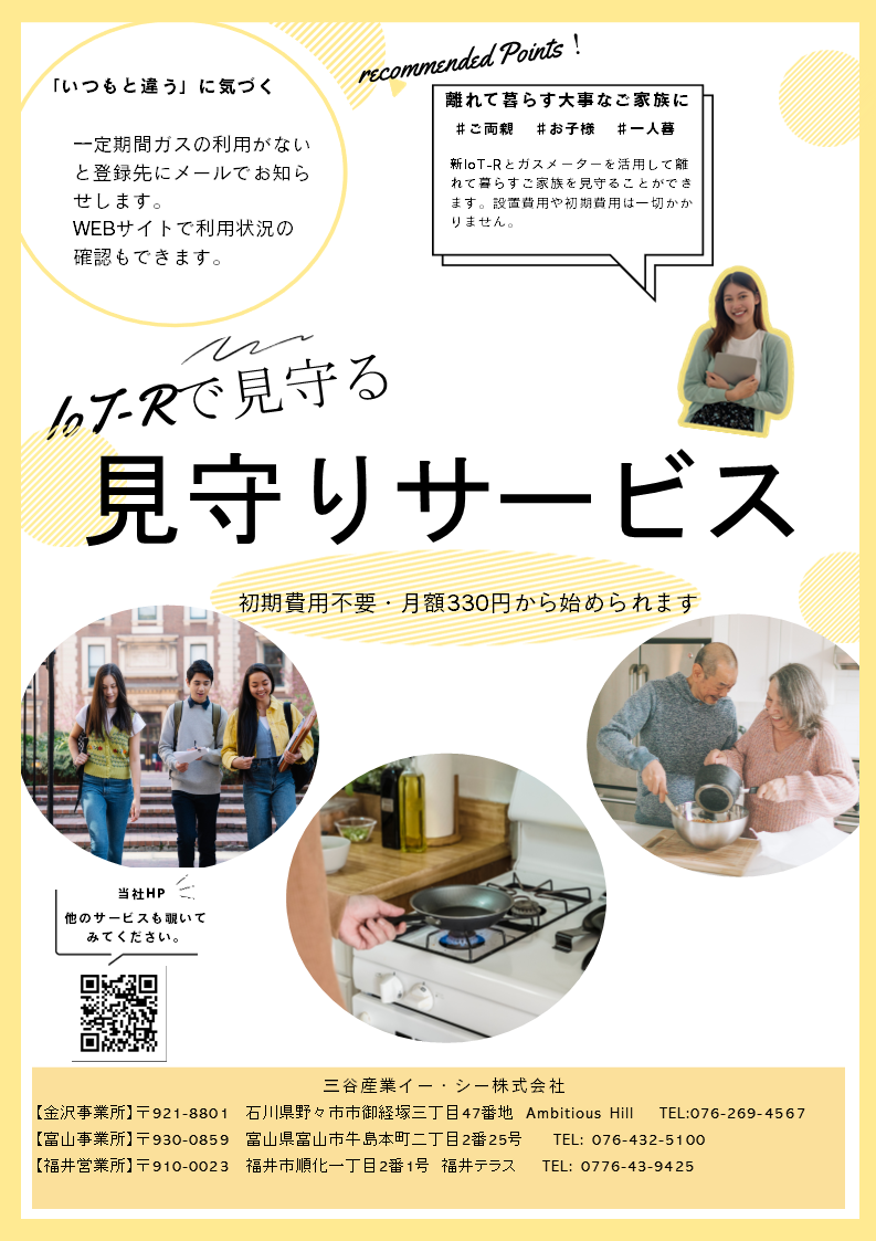 三谷産業株式会社(本社:石川県金沢市/代表取締役社長:三谷 忠照、以下 三谷産業)のグループ会社で、主に北陸で化学品やLPガス・石油製品等の販売を行う三谷産業イー・シー株式会社(本社:石川県野々市市/代表取締役社長 山﨑 泰司、以下 三谷産業イー・シー)は、LPガス販売の新たな付加価値サービスとして、ガスメーターの通信端末を活用した見守りサービスと、リンナイ製のガス衣類乾燥機「乾太くん」(※1)のサブスクリプション(定額制)サービスを12月15日より開始しました。