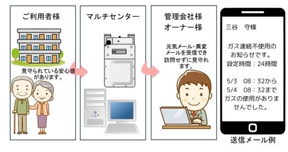 ガスは、食事の支度や入浴など生活に欠かせないエネルギーであり、日々適切に利用されていれば、単身者がきちんと暮らしているかを推定できる一つの目安になります。三谷産業イー・シーでは、このような特性を利用して、ガスメーターに設置しているLPWA(無線通信技術)端末を利用し、例えば一定期間ガスの利用が無い場合に事前登録いただいた通知先に電子メールを自動配信する「見守りサービス」を開始しました。