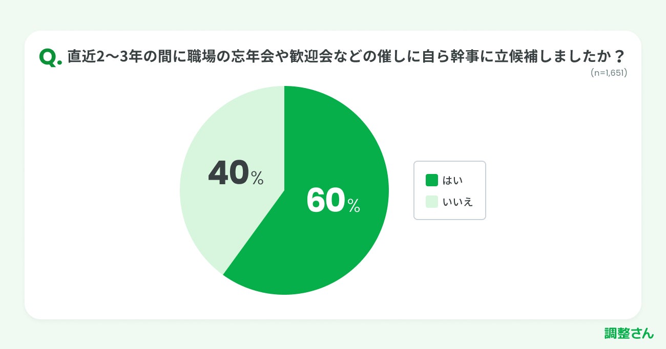 直近2~3年の間に職場の忘年会や歓迎会などの催しで幹事を経験した人に対し、自ら幹事に立候補したかどうかを聞くと、全体の60%が「はい」と答え、過半数以上が率先して幹事を担当していることがわかりました。
