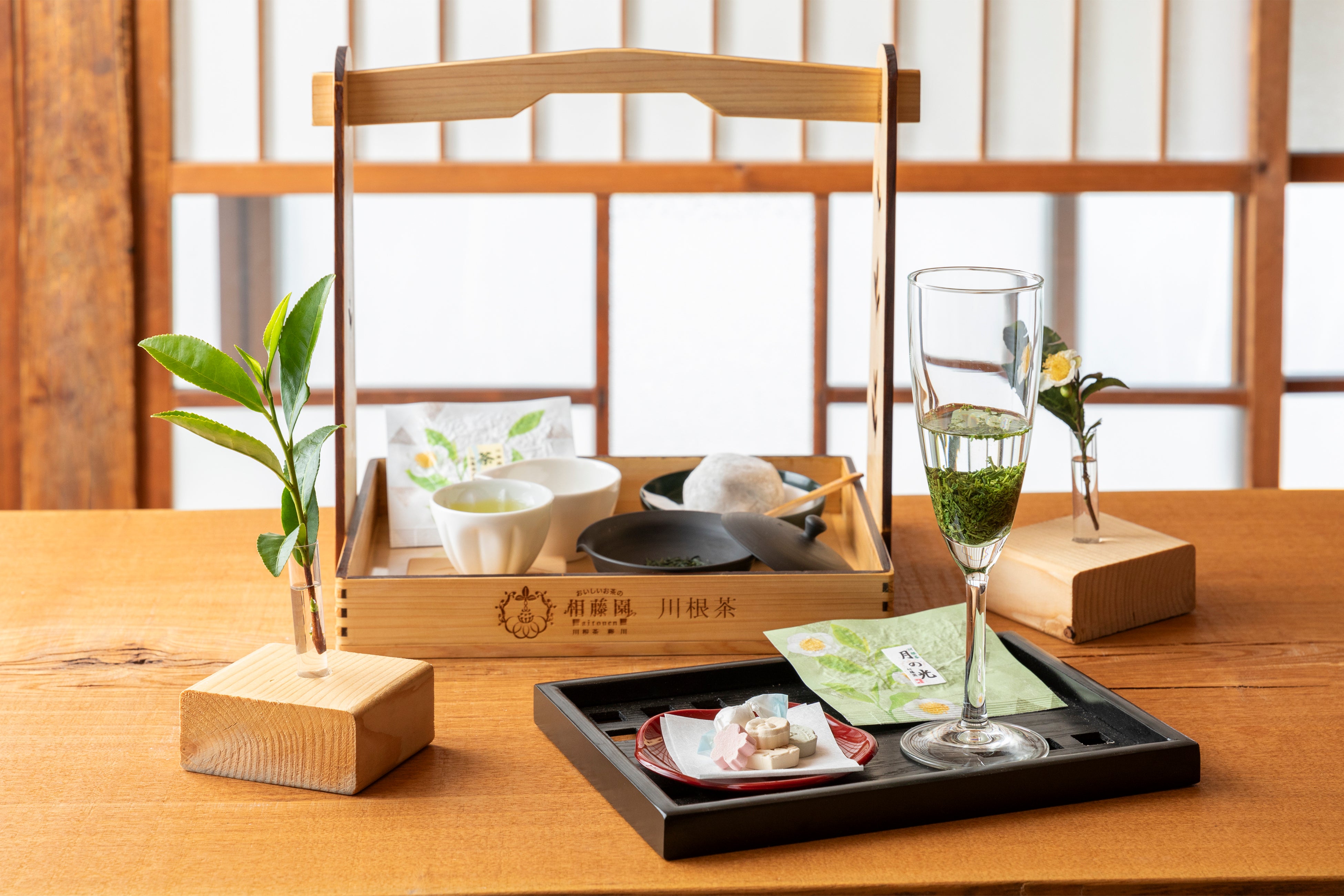 雄大な大井川を望む美しいティーテラスにて、普段は市販されていない希少な川根茶をいただくことができます。お茶請けの大福や和三盆の洗練された甘みに心がほぐれます。