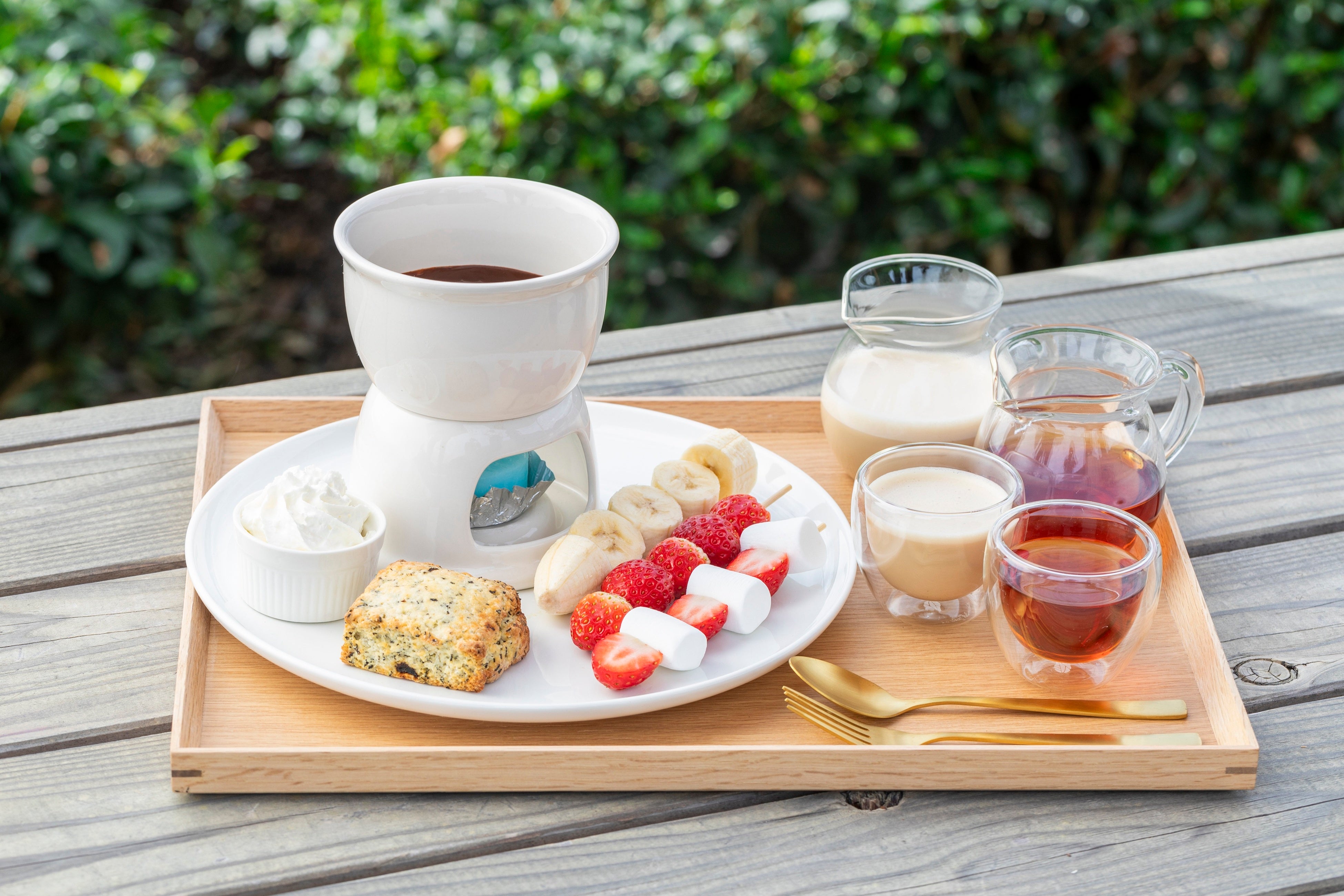 茶畑が広がるテラスで、和紅茶と一緒にチョコレートフォンデュを。