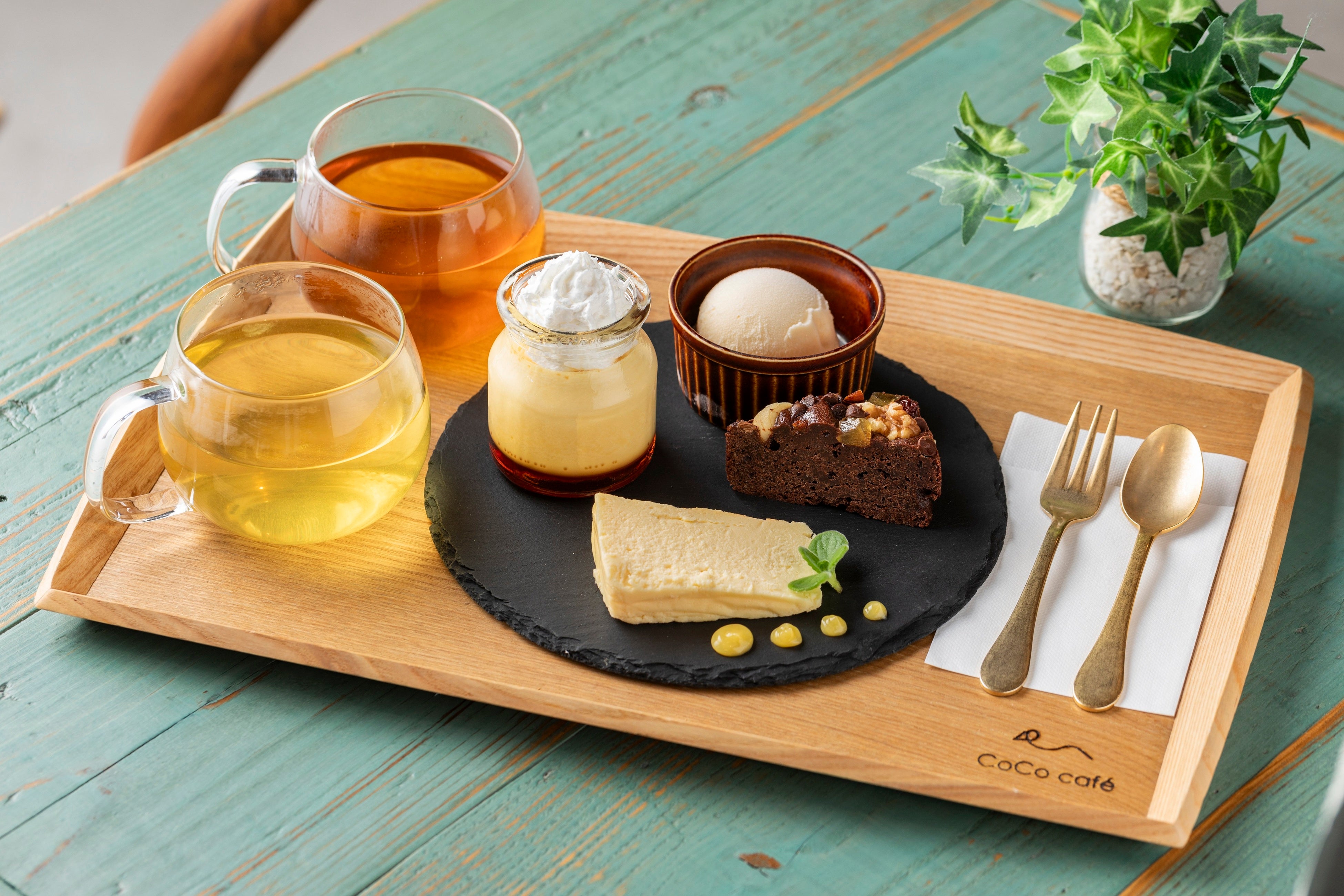 かためのプリンやチョコブラウニーと共に心地いいリラックスタイムを。