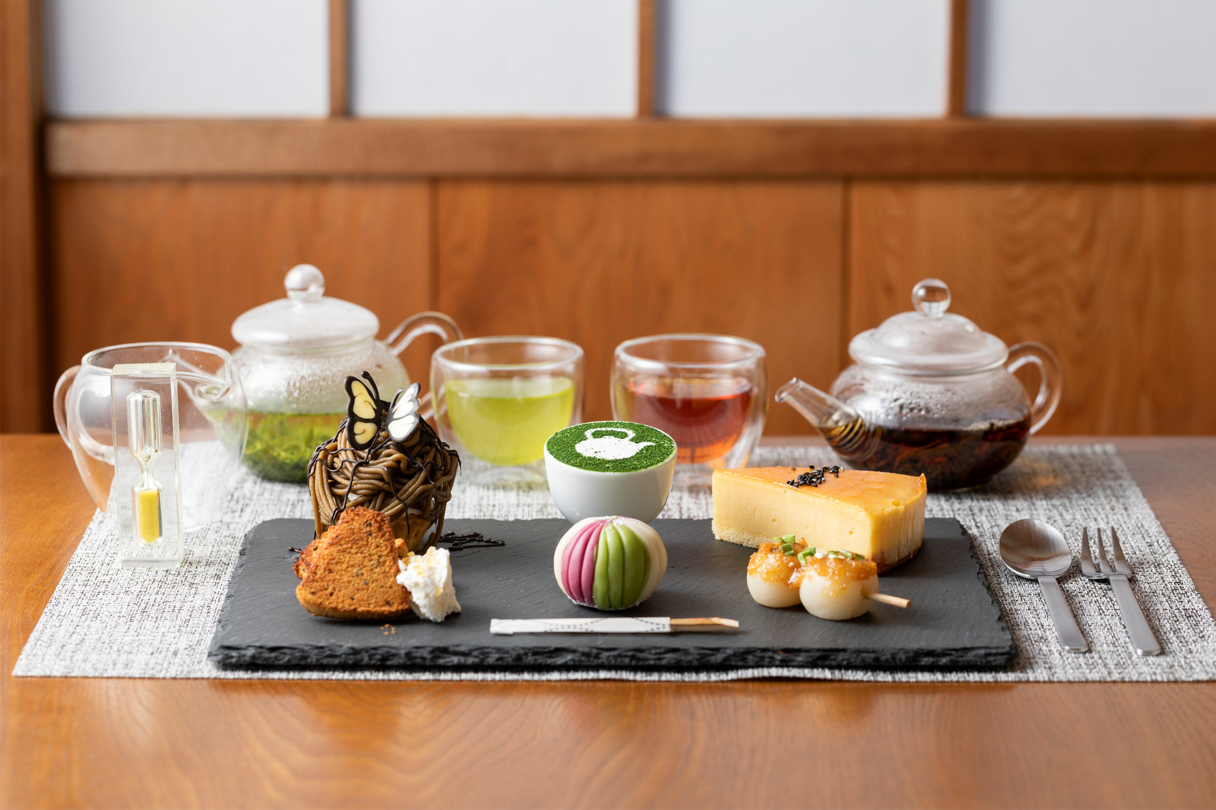 ほうじ茶モンブランやごまみそだんごなど、和洋のバランスがとれた6種類のスイーツも絶品です。