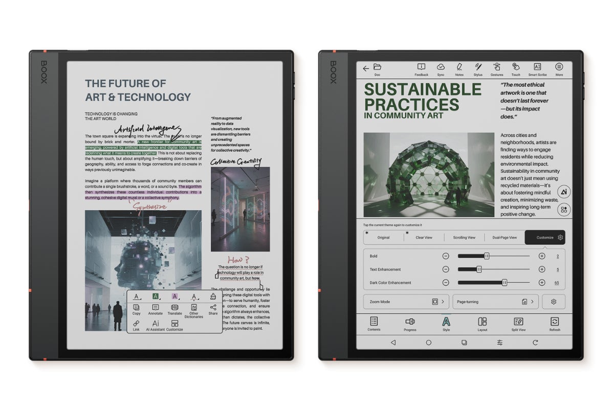 BOOX独自のPDFアプリ「NeoReader」は、研究論文や技術資料の閲覧に最適化された高性能リーダーです。表示モードやコントラスト、カラーフィルターなどを細かく調整でき、Kaleido 3カラー電子ペーパーの特性を最大限に引き出します。リフロー表示、複数ページ表示、ハイライト、手書き注釈、翻訳、AI要約など、学習・ビジネスの双方に役立つ機能を搭載。さらに、ページレイアウトや余白のカット、画面回転なども柔軟に行えます。