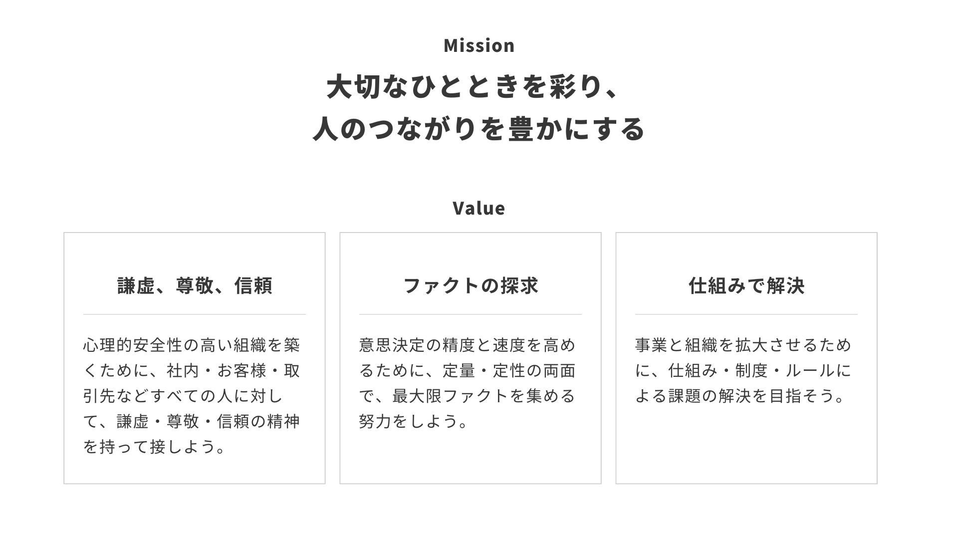 「大切なひとときを彩り、人のつながりを豊かにする」というミッションのもと、「Be Heartful/Think Forward/Challenge Professionally」を社員全員が意識し、プロ集団として互いを尊重し、常に挑戦の気持ちをもってサービス改善に取り組んでまいりました。