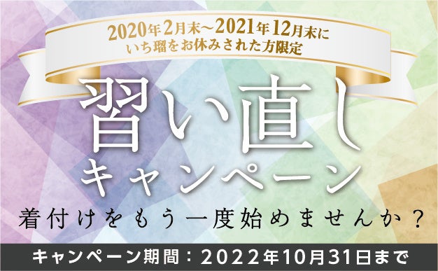 いち瑠に通われていて、着付けを学び続けたいと思われていても、新型コロナウイルスの感染拡大などの理由から、お休みされた方も多いかと思います。一度は諦めてしまったけれど、そろそろまた習い始めたいと思われている方へキャンペーンのお知らせです。