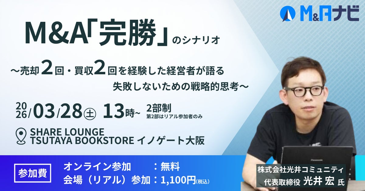 M&Aテクノロジーを展開する株式会社M&Aナビ(本社:東京都品川区、代表取締役:瀧田 雄介、以下「当社」)は、売却2回・買収2回を経験した株式会社光井コミュニティ代表取締役の光井宏氏をゲストにお迎えして、将来M&Aを検討している経営者向けのセミナーを2026年3月28日(土) 13時から開催いたします。