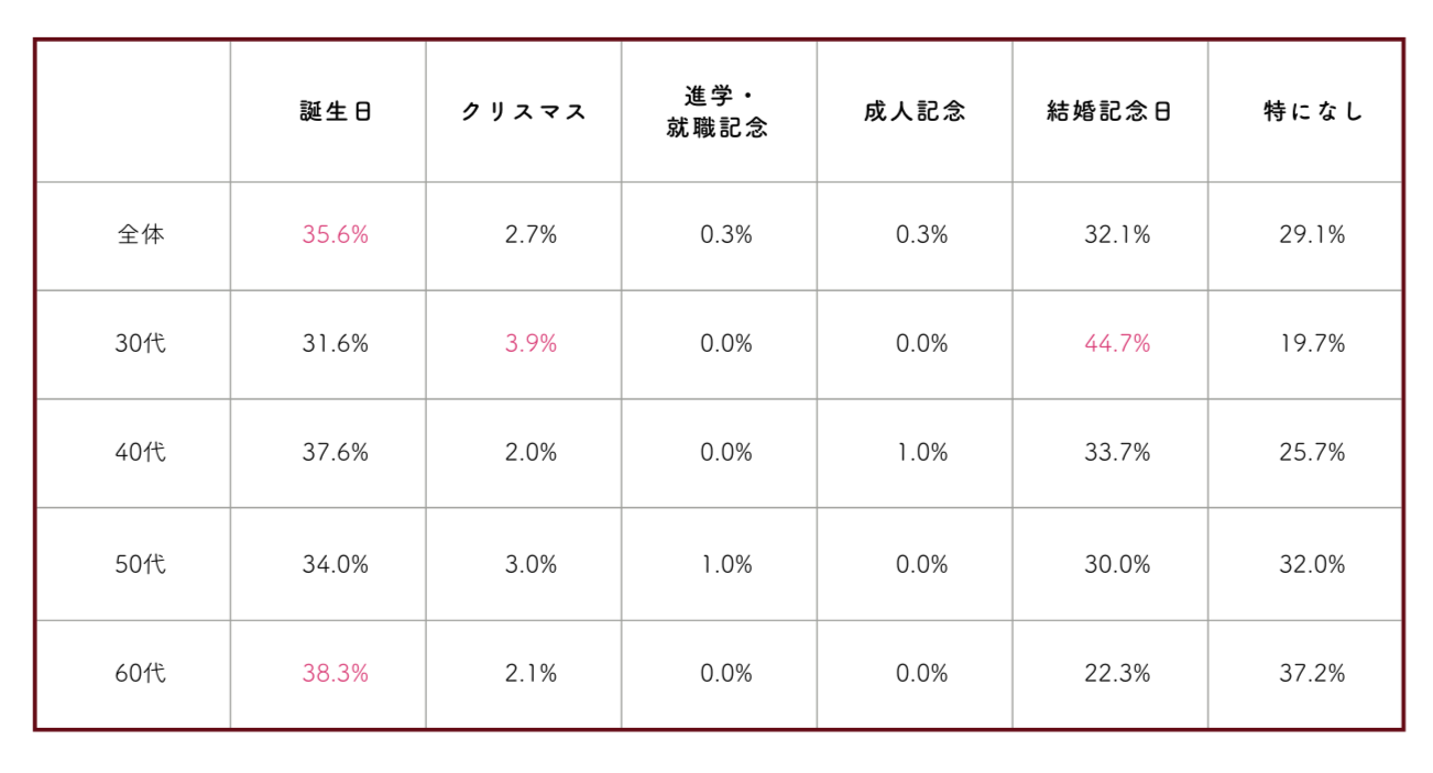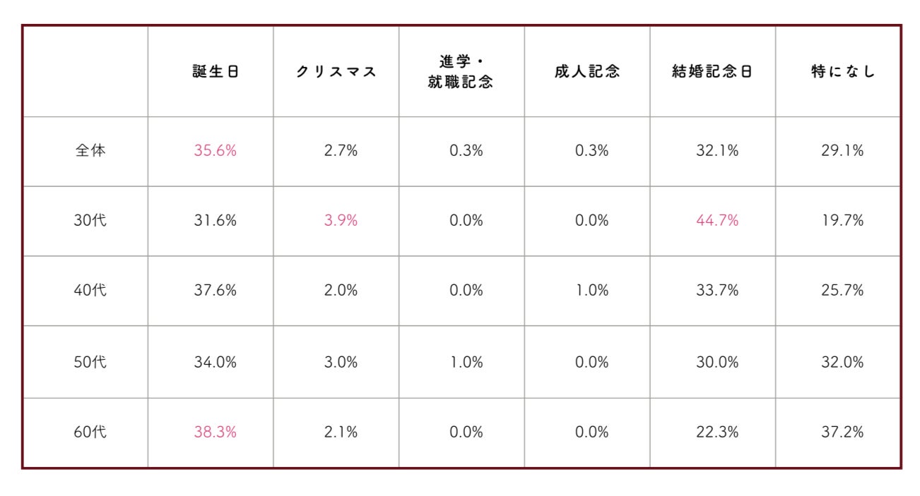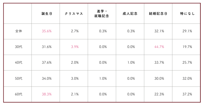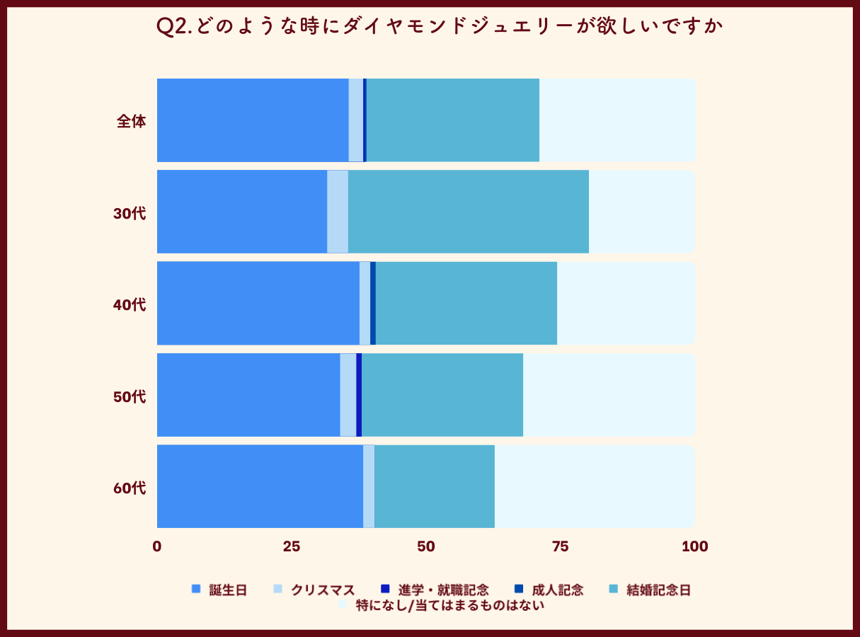 また、30代の女性に関しては、「結婚記念日」と「クリスマス」が他の世代と比較して最も高い回答となりました。このことから、彼女たちは結婚や特別なイベントに、ダイヤモンドジュエリーを贈られることを望んでいることがうかがえます。年齢や経験によって入手機会は異なるようですが、ダイヤモンドジュエリーは特別な時に贈られることで、より一層の価値や意味を持つものとなるようです。