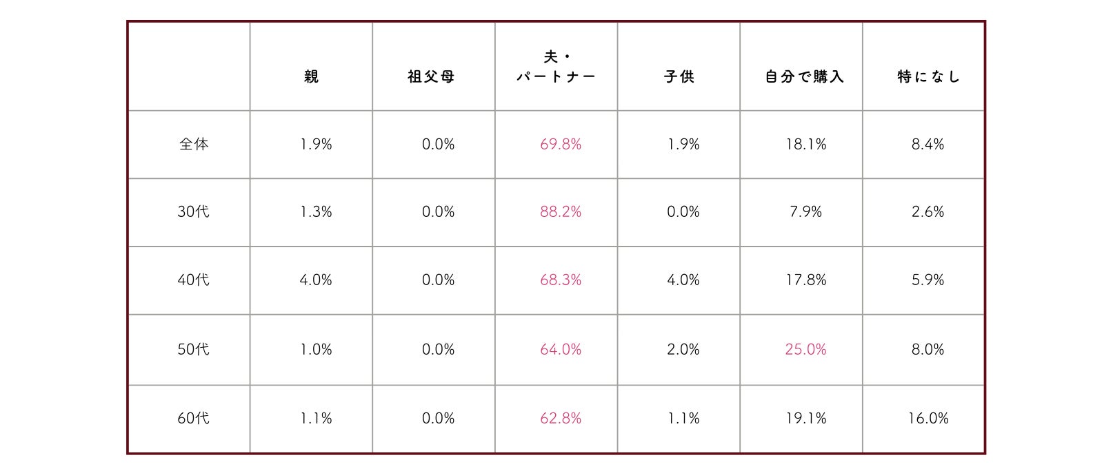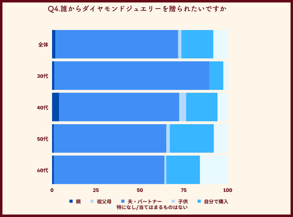 30代から60代の約70%の女性が「夫・パートナー」からダイヤモンドジュエリーを贈られたいと回答しました。この結果から、女性たちは年齢に関係なく、大切な人からダイヤモンドジュエリーを贈られることは、どの年代でも喜ばしいことであると言えます。