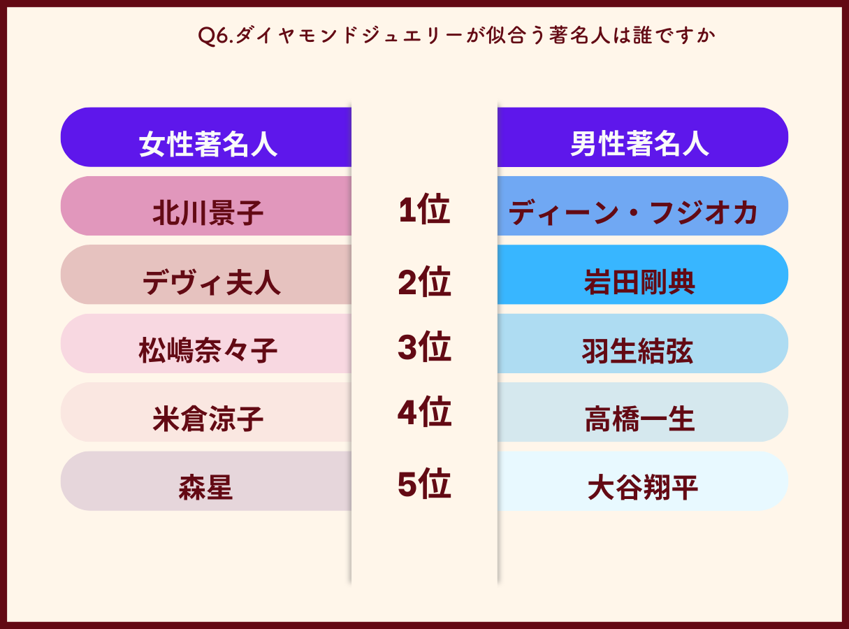 全世代の中で「北川景子さん」が堂々の1位に輝きました。彼女は上品な雰囲気を漂わせるクールビューティーとして知られています。北川景子さん自身だけでなく、ご主人であるDAIGOさんとの華麗なるバックグラウンドも、ダイヤモンドジュエリーがよく似合うと思われている要因かもしれません。