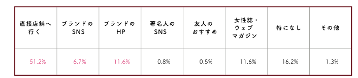 調査対象の半数以上の女性がダイヤモンドジュエリーを探す際には「直接店舗に行く」と回答しました。一方で、全体の約3割は「ブランドの公式ウェブサイトやSNSを参考にする」と回答しました。