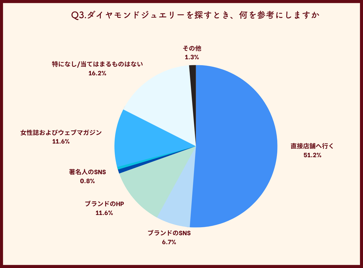 この結果から明らかなのは、デジタル時代においても実際の店舗に足を運んでダイヤモンドジュエリーを購入したいというニーズが依然として強いといえます。実物を見たり触れたりすることで、商品の品質や輝きを確認したり、自分に合ったデザインやサイズを選ぶことができる利点は対面だからこそ得られること。一方で、全体の約3割がブランドの公式ウェブサイトやSNSを参考にすると回答したことから、デジタル情報の活用も重要視されていることがわかります。オンライン上で商品の写真や説明を確認したり、他の人の口コミや評価を参考にすることで、効率的に情報収集を行い、自分に合ったダイヤモンドジュエリーを見つけることができます。