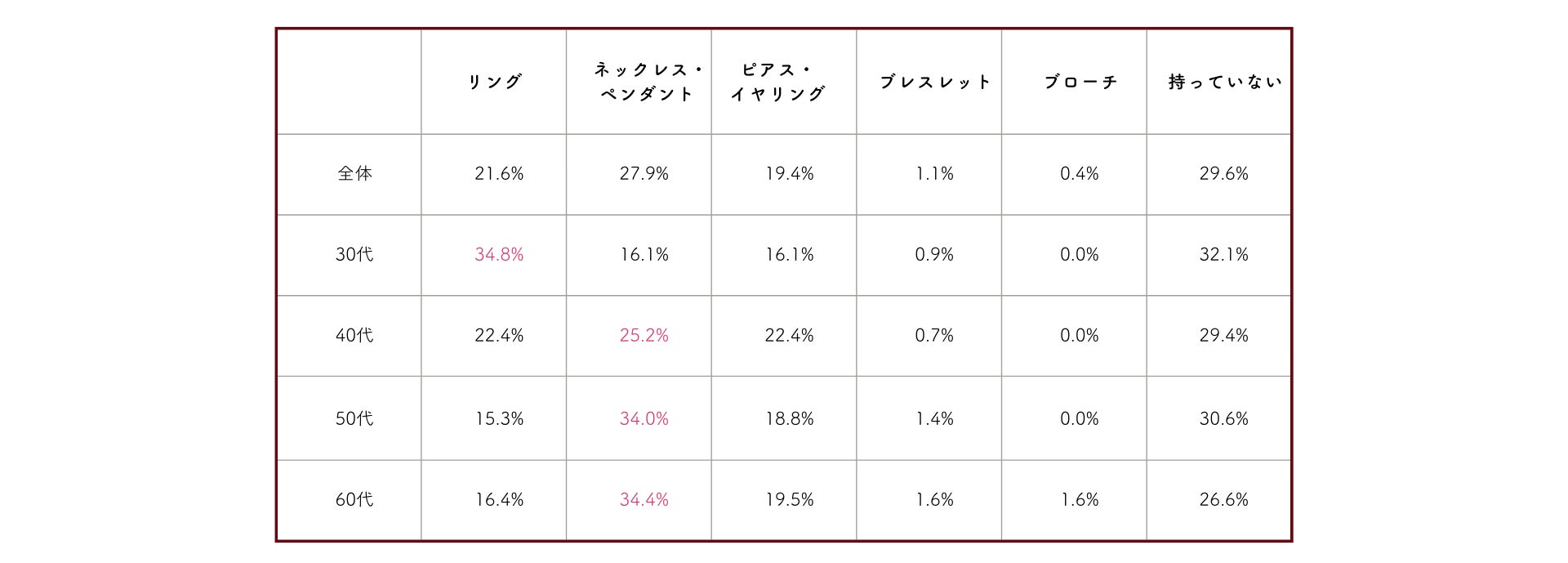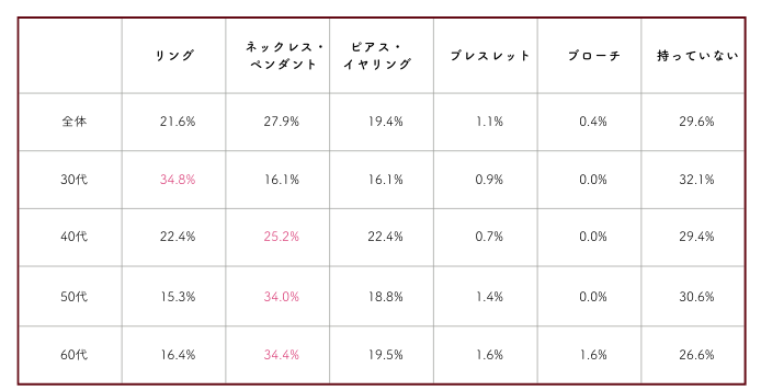 30代では、リングの着用が最も一般的。年齢が上がるにつれてネックレスやペンダントの着用が増加傾向