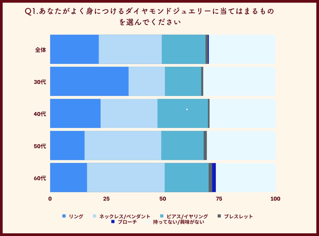 「あなたがよく身につけるダイヤモンドジュエリーに当てはまるものを選んでください」という質問に対する調査結果を見ると、全体的にはネックレスやペンダントが最も多く、次いでリング、ピアスやイヤリングという順位になりました。特に30代の女性は、他の世代と比較して明らかにリングが最も人気でした。この調査結果からわかることは、女性たちはダイヤモンドジュエリーの選択において個人の好みや年齢による傾向があるということ。 30代の女性にとってはリングが特に重要なアイテムであり、年齢を重ねるごとにネックレスやペンダントがより魅力的な選択肢となっているようです。