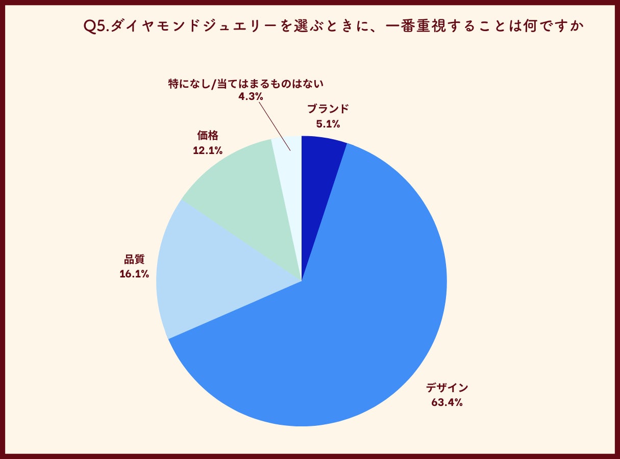 約60%の女性が「デザイン」を最も重視し、次に「品質」も重要視すると回答しました。ジュエリーのデザインは、購入の決定において最も重要な要素であり、その次に品質が続くようです。