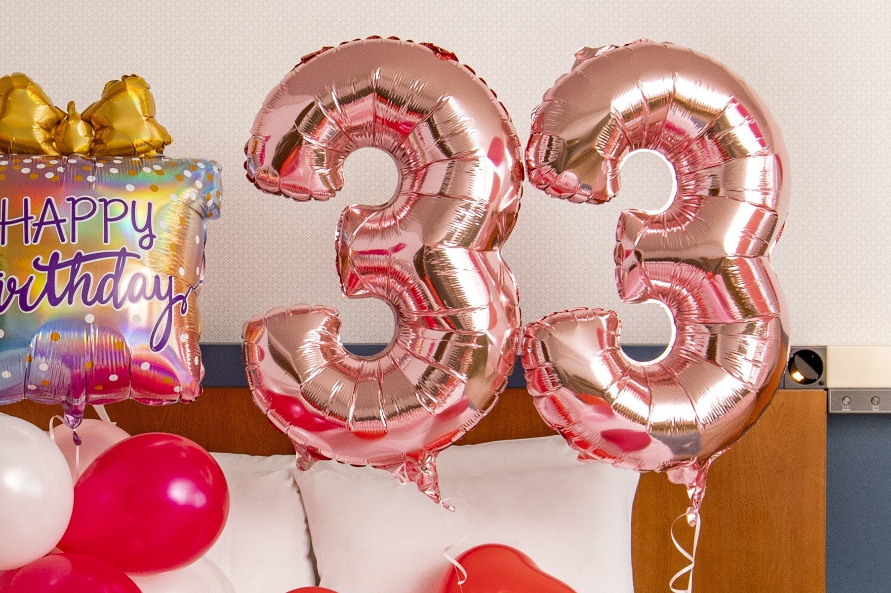 客室に足を踏み入れた瞬間、目の前に広がる華やかな「バルーンデコレーション」は、お誕生日や記念日、サプライズなど様々なシチュエーションに合わせてお選びいただけるピンク、ブルー、ゴールド、スマイリーの4種類のスタイルをご用意いたしました。また、お客様にとって特別な意味がある数字や文字を模ったバルーンや、お好きな文字を刻印できるバルーンを追加オプションでカスタマイズいただけます。