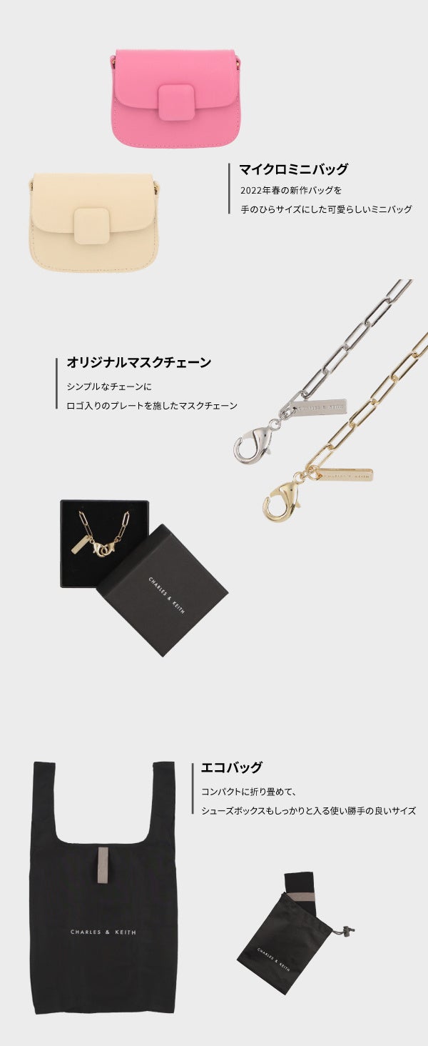 カラフルでキャッチーなスプリングアイテムが彩る店内には、約150スタイルのバッグやシューズが展開され、毎週のように新作が入荷されます。また、今回のオープンを記念して、それぞれ数量限定のノベルティをご用意しております。この機会にぜひチャールズ&キースでのお買い物をお楽しみください。