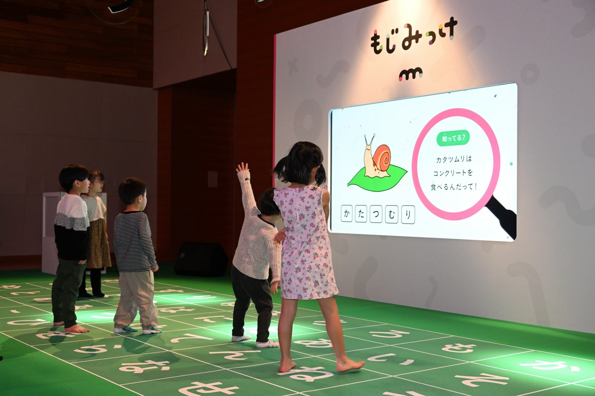 これは何の絵? 床に並んだたくさんのひらがなの中に、モノや生きものの名前が隠れてる。体を動かして隠れた文字をみつけよう。