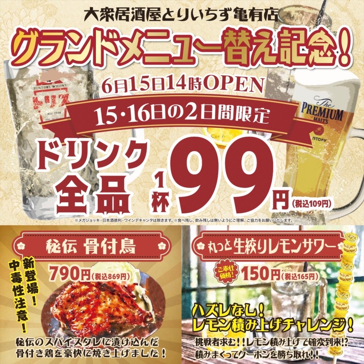 リニューアルオープン&グランドメニュー替えを記念して6月15日(土)、16日(日)の2日間限定!ドリンク全品99円(税込109円)セール開催決定!新しく生まれ変わったとりいちずをお得に楽しめる2日間♪