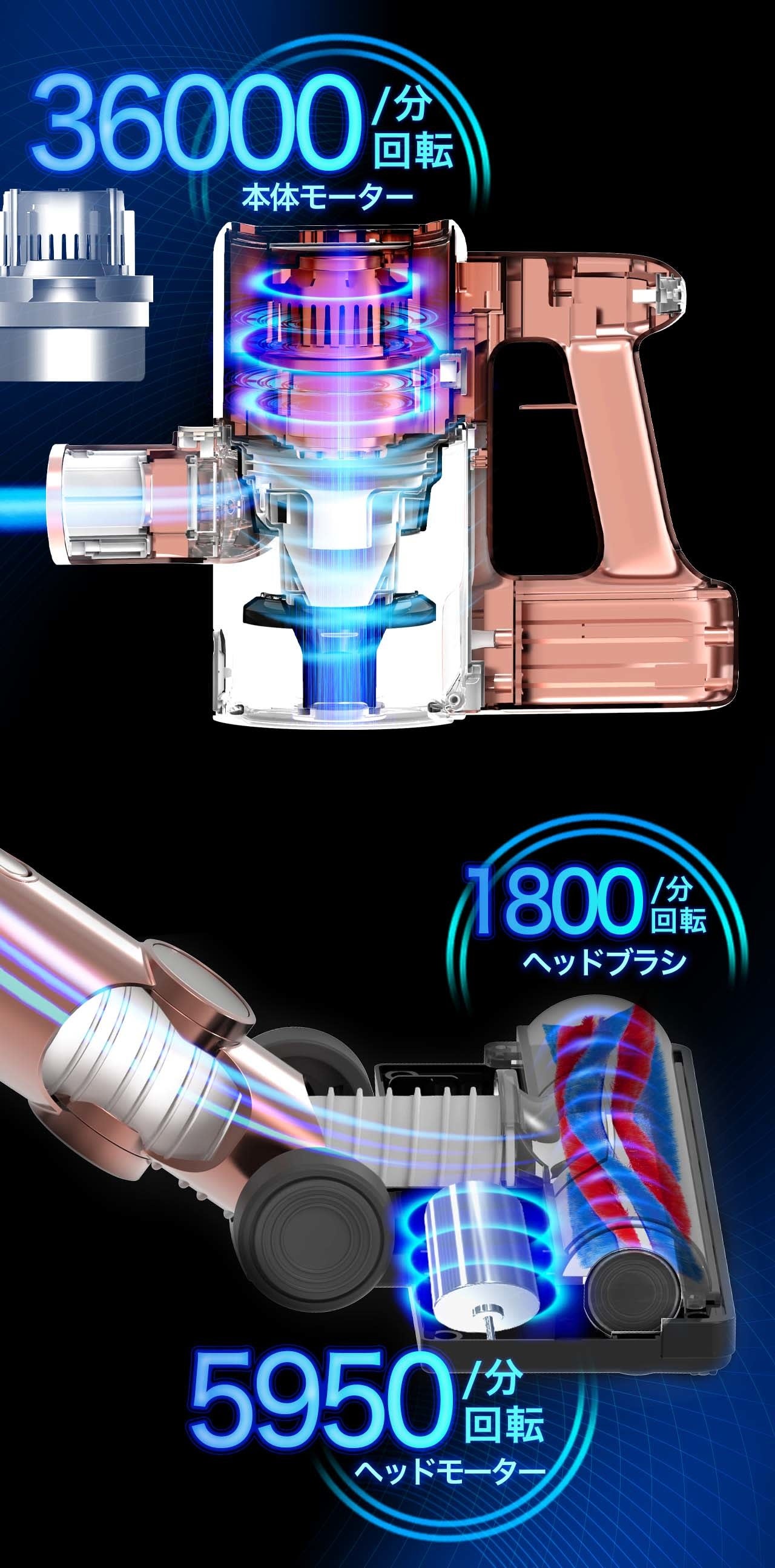1分間に約36000回転する本体モーターと1分間に約5950回転するヘッドモーターにより、最大10000paの吸引力と毎分約1800回転するヘッドブラシを実現しました。