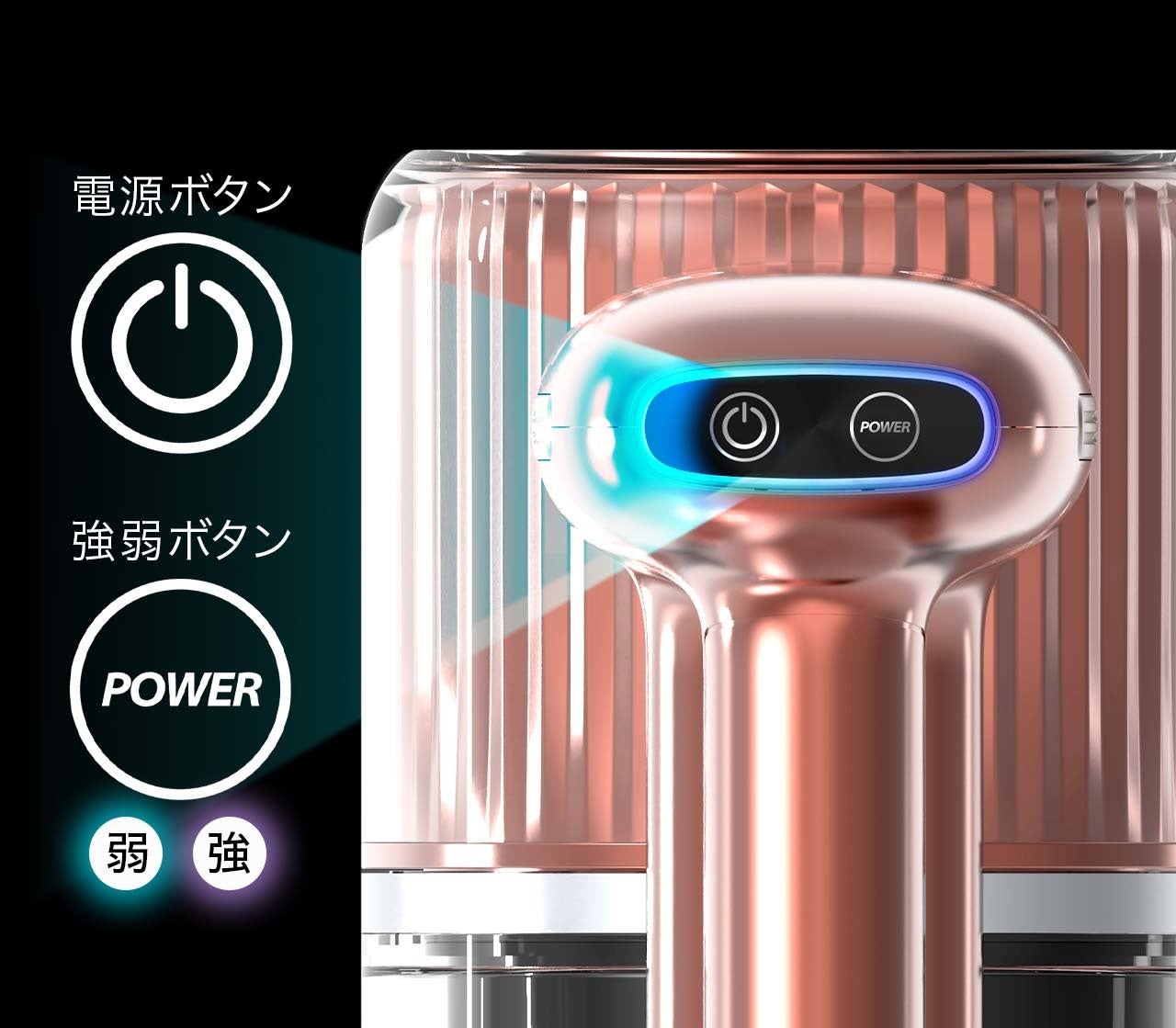 電源ボタンでオン/オフを、強弱ボタンで吸引力の強/弱を切り替えます。