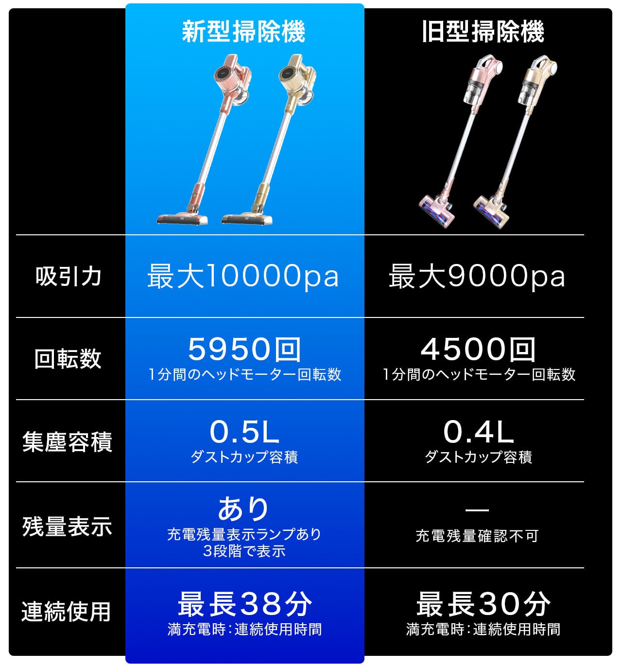 内部構造やデザインを変更したことにより、吸引力はもちろん、連続使用時間や集塵容積などが増加しました。