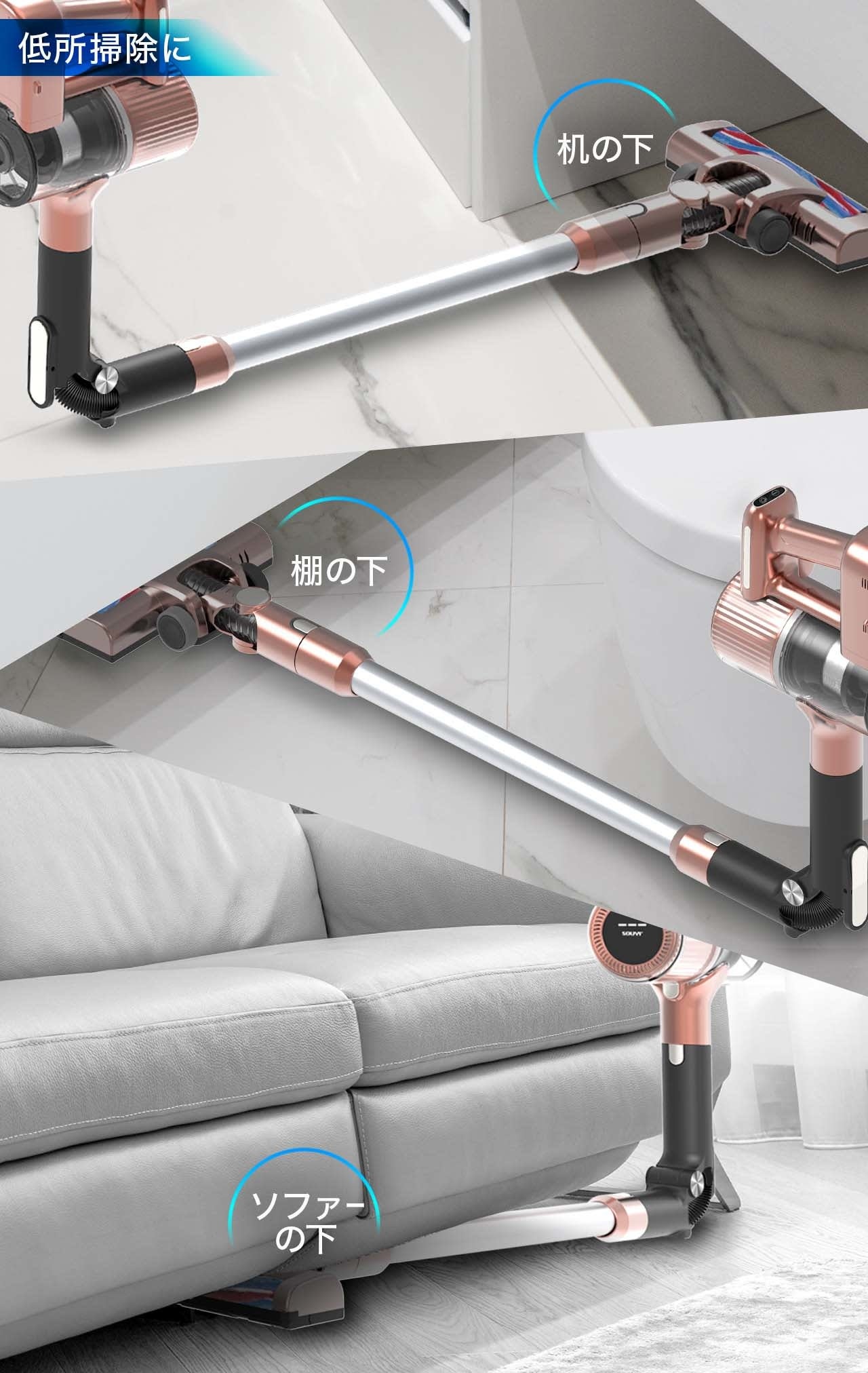 かがんだり、低姿勢になることなく、立ったまま低所の奥までヘッドが届き、腰への負担を軽減します。