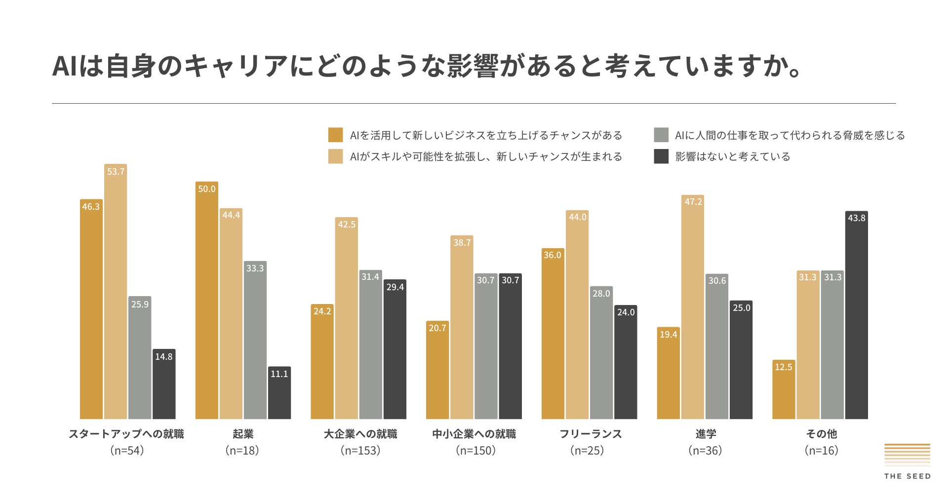 また、スタートアップへの就職や起業に興味のある人とそうでない人とを比較した場合、スタートアップや起業に興味のある人の方が、AIに対してポジティブな印象を持っていることがわかりました。