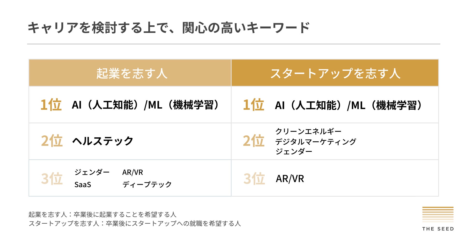 ・起業やスタートアップを志す人がキャリア検討で関心のあるキーワードは「AI(人工知能)/ML(機械学習)」がトップ