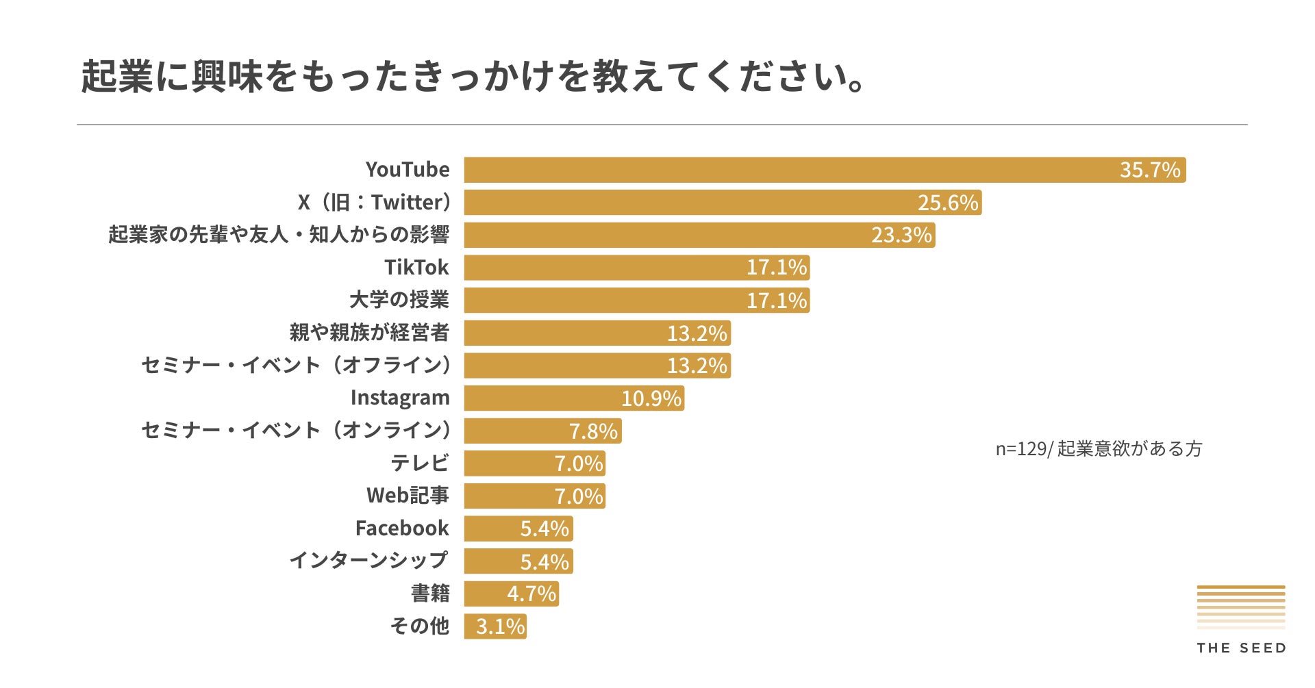 起業に興味をもったきっかけを尋ねたところ、「YouTube」が35.7%で最も多く、「X(旧:Twitter)」が25.6%、「起業家の先輩や友人・知人からの影響」が23.3%と続きました。また、「TikTok」も17.1%の回答を得ており、SNSが学生の起業意識に大きな影響を与えていることがわかりました(n=129/起業意欲がある方)。