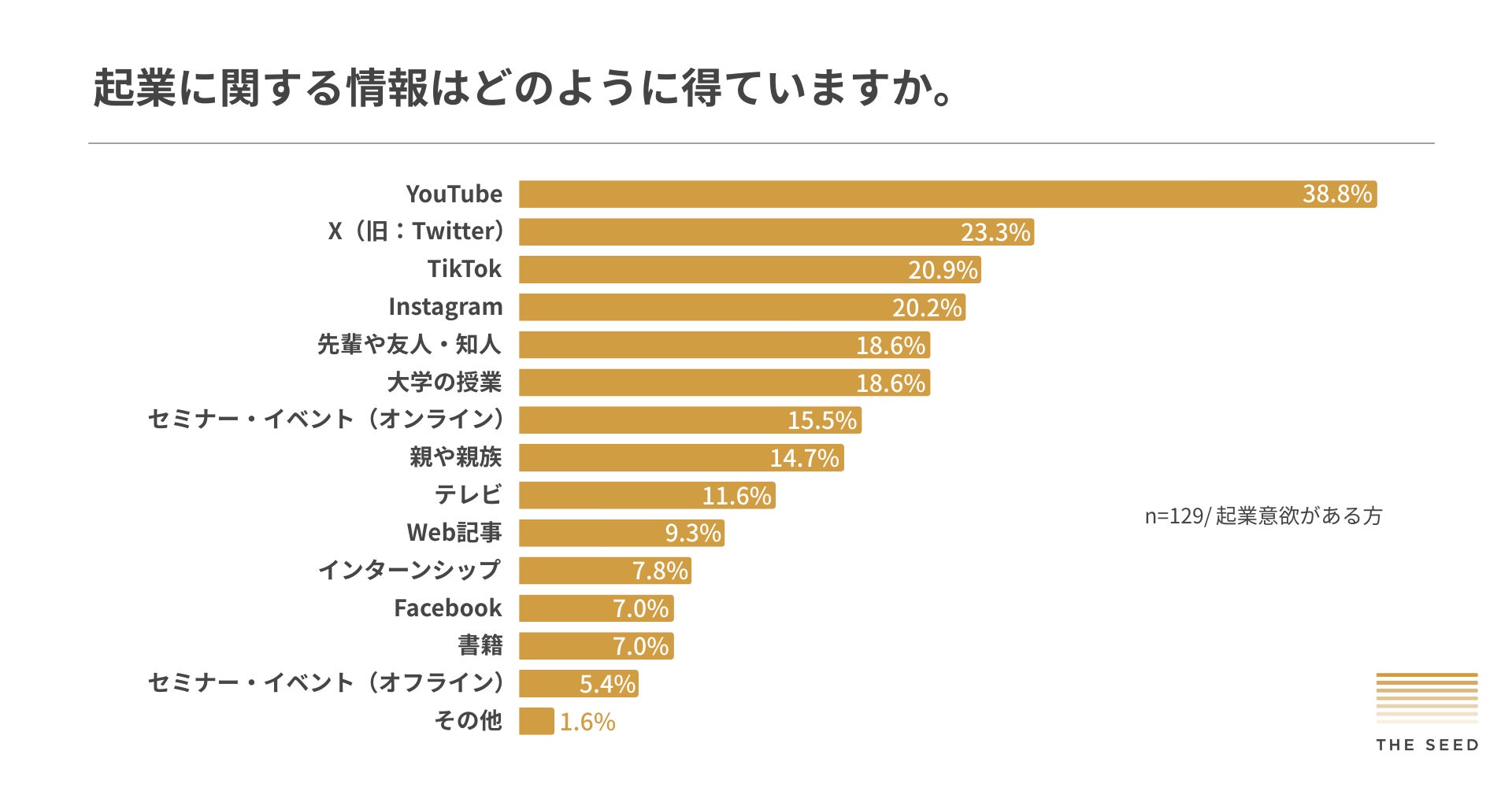 起業に関する情報はどのように得ているか尋ねたところ、「YouTube」が38.8%で最も多く、「X(旧:Twitter)」が23.3%、「TikTok」が20.9%と続きました。