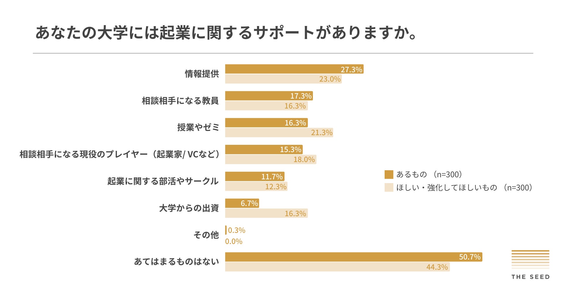 また、どのようなサポートがほしいのか・強化してほしいのか尋ねたところ、「情報提供」が23.0%で最も多く、「授業やゼミ」が21.3%、「相談相手になる現役のプレイヤー(起業家/VCなど)」が18.0%と続きました。情報提供に対するニーズが高く、実践的なサポートや教育機会の強化も求められていることがわかりました(n=300)。