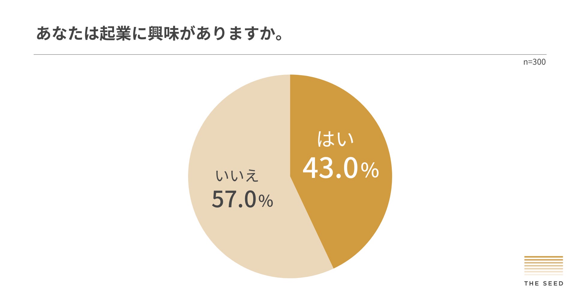 起業に興味があるか尋ねたところ、43.0%が「興味がある」と回答しました(n=300)。