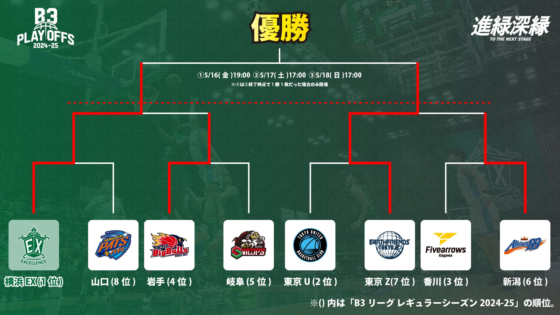 ・「B3リーグ レギュラーシーズン 2024-25」上位8クラブでの「B3リーグ プレーオフ 2024-25」(トーナメント戦)を行い、シーズンの順位を決定。