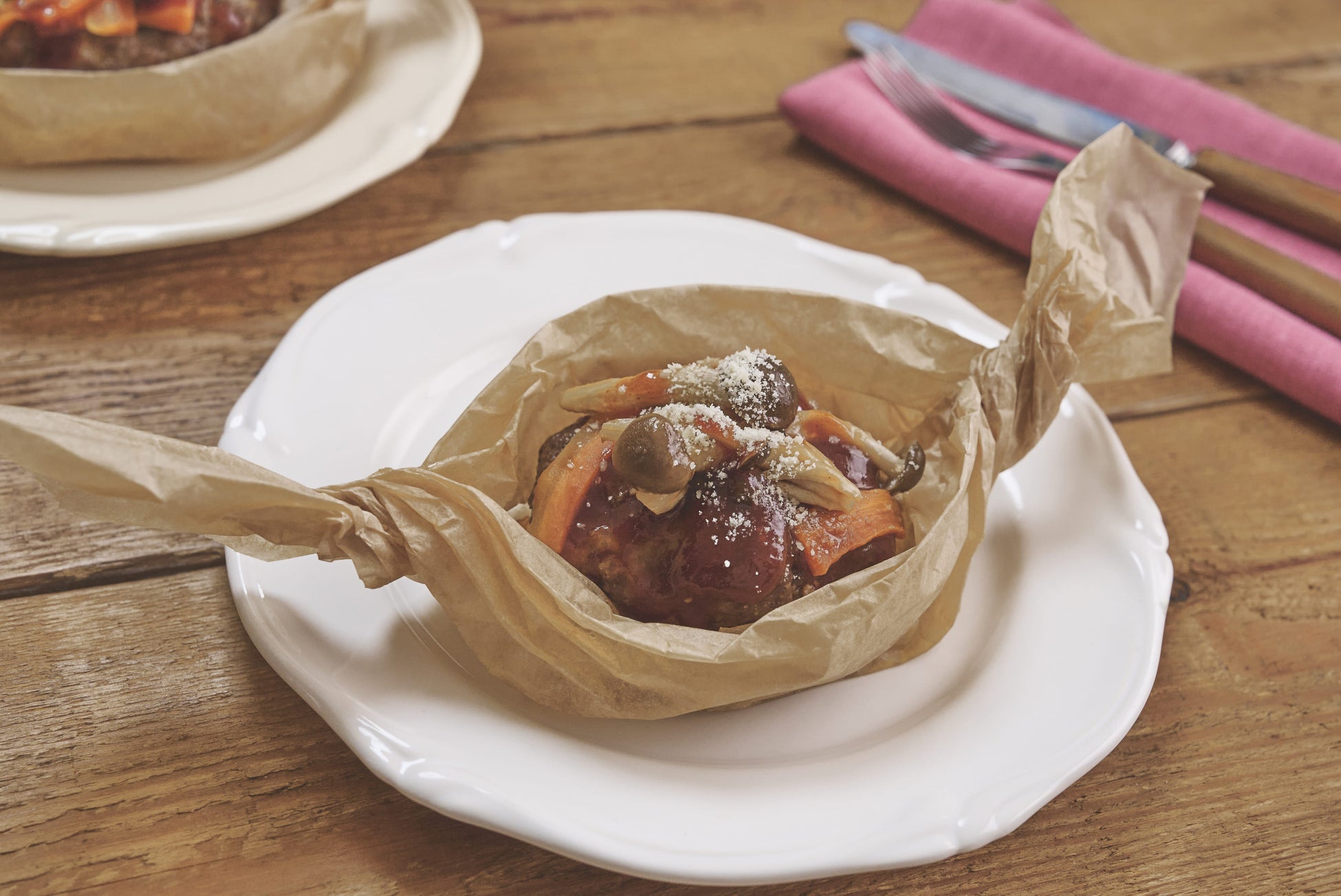 「クックパー® ブラウンクッキングシート」と電子レンジで、フライパンを使わずに簡単にハンバーグが作れます。クッキングシートに包んで加熱することで、旨味を逃さず、ジューシーな仕上がりに。