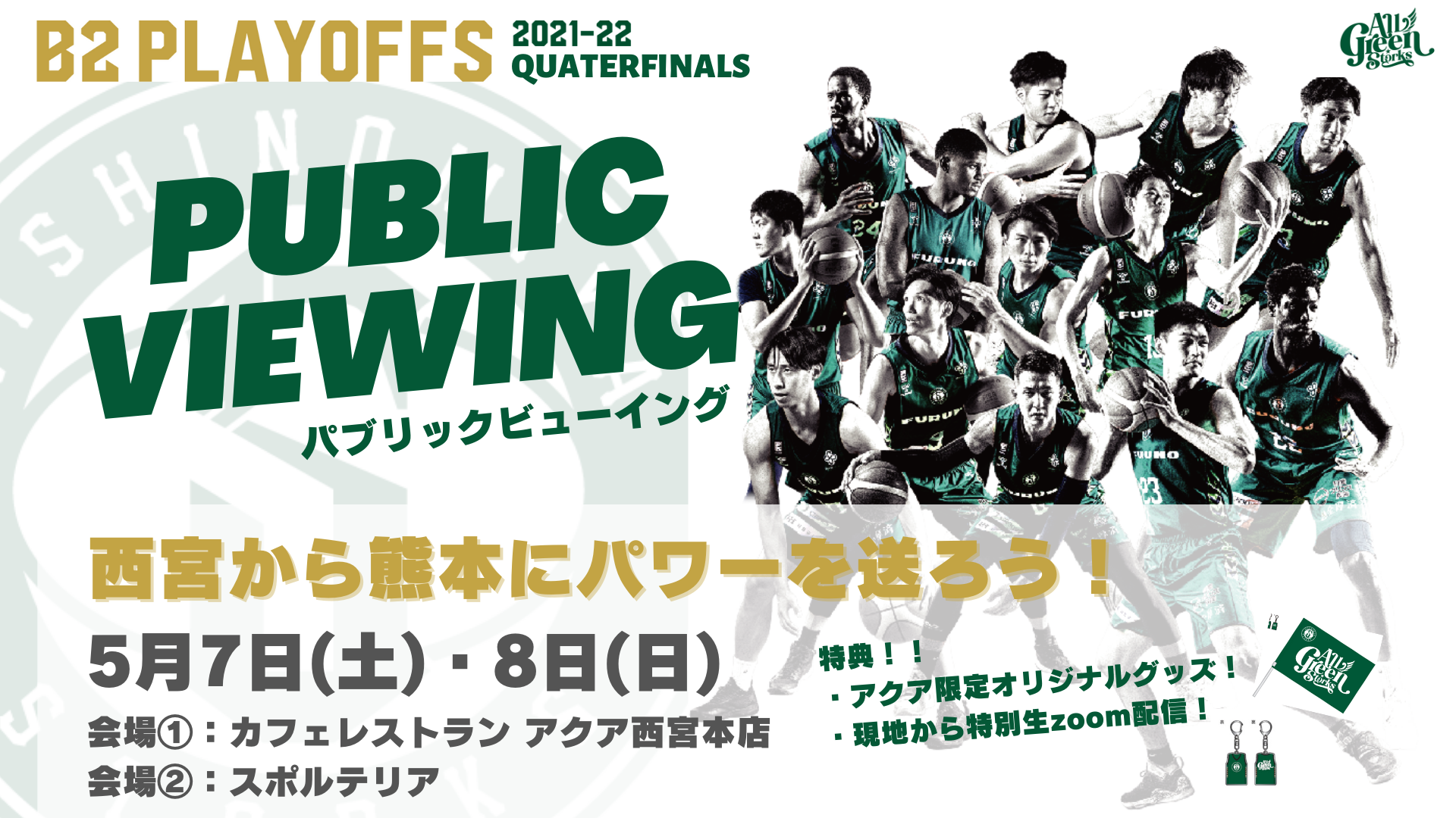 Bリーグ2部に所属する西宮ストークス(兵庫県西宮市)は、5月7日(土)から敵地の熊本で始まる「B2 プレーオフ2021-22 クォーターファイル」のパブリックビューイング企画を飲食店と共同で開催します。5月7日(土)と8日(日)の2日間で実施する予定で、現地・熊本へ観戦に行けない皆さんと一緒に、パブリックビューイング会場から現地へ想いを伝えます。