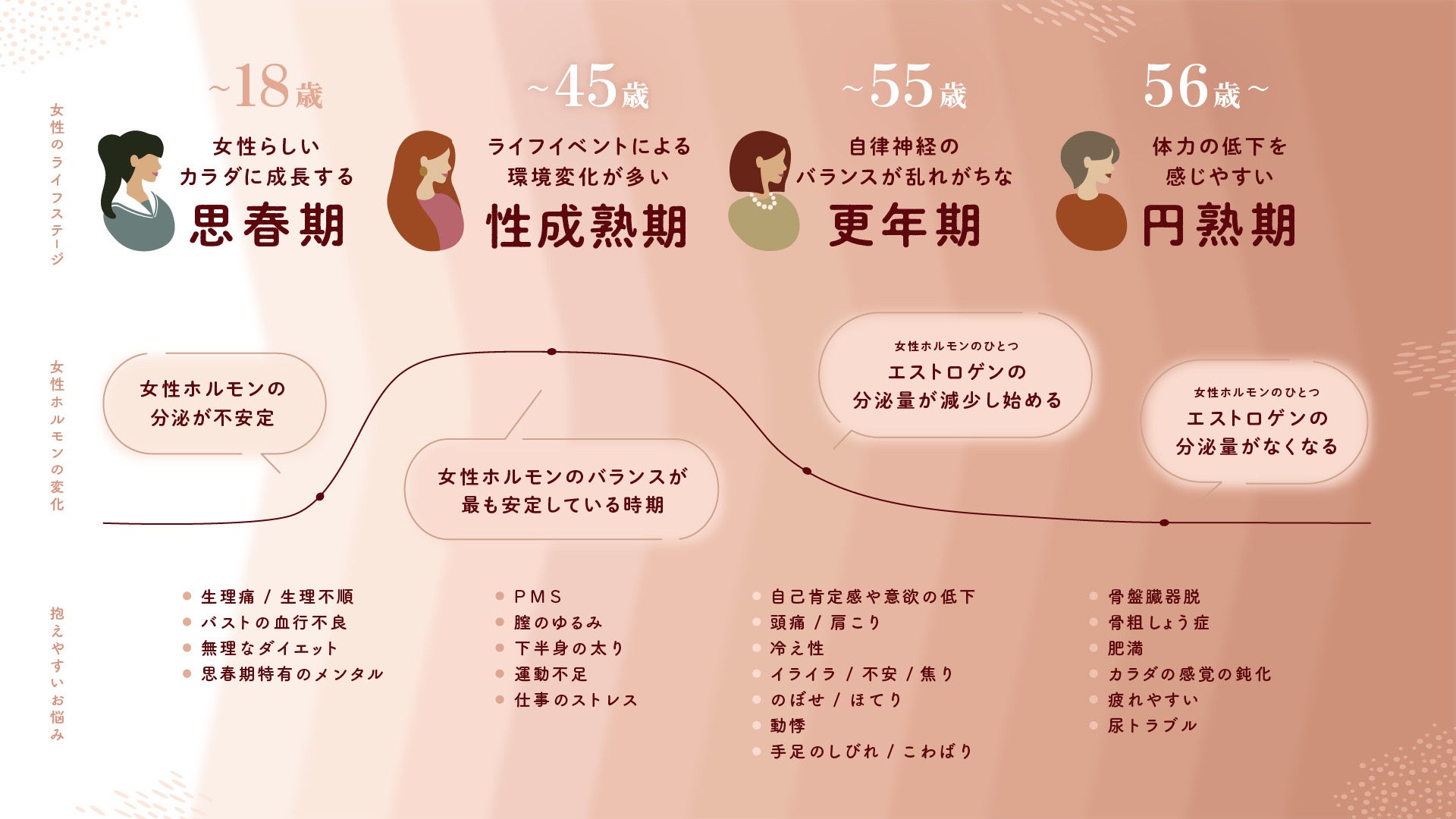 女性のカラダは生涯にわたって女性ホルモンと密接に関係しています。初潮を迎える思春期から年齢を重ねるにつれて、女性ホルモンのバランスは変化していき、女性の心身にさまざまな影響をもたらします。日本人女性は月経トラブルやホルモンバランスに伴う不調があっても我慢してしまいがち。女性特有のカラダの悩みを持っている人は多いのに、「仕方がないから。」「あまり人に言う事じゃないから。」と一人で抱えてしまう人が多く、世界と比較しても日本人は女性のヘルスケアリテラシーがとても低いことが分かっています。女性が心身ともに健康でいるためには、女性ホルモンについて正しく理解し、自身のホルモンバランスを知ることがとても大切です。そして、ホルモンバランスを整えることを意識していくことで、日常生活をより快適に過ごすことができます。