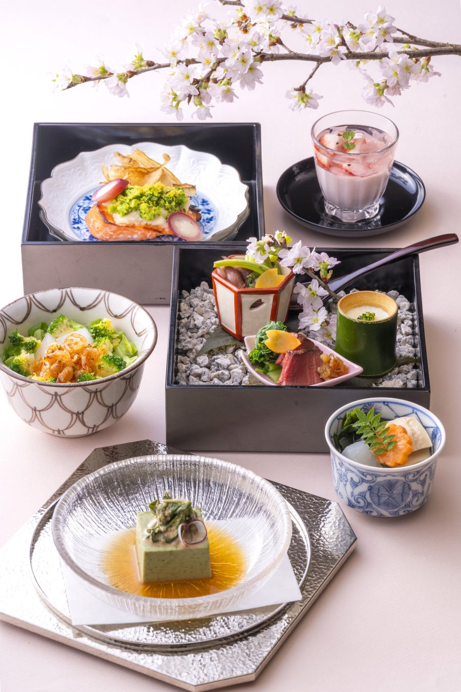 日本料理・東山では「桜メニュー」としてランチコース(8,000円)、ディナーコース(15,000円)をご用意しています。石庭をご覧になりながら、地酒や銘酒とともに東山ならではの春の味覚をお楽しみください。