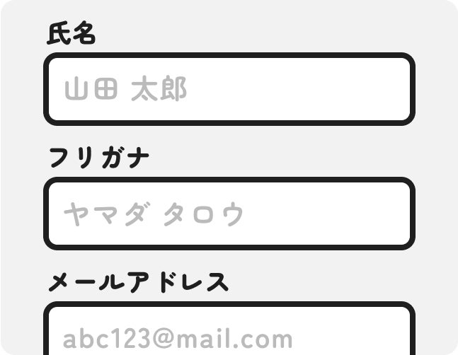 「例:山田 太郎」などサンプル文字を表示し、正しい入力形式を案内します。
