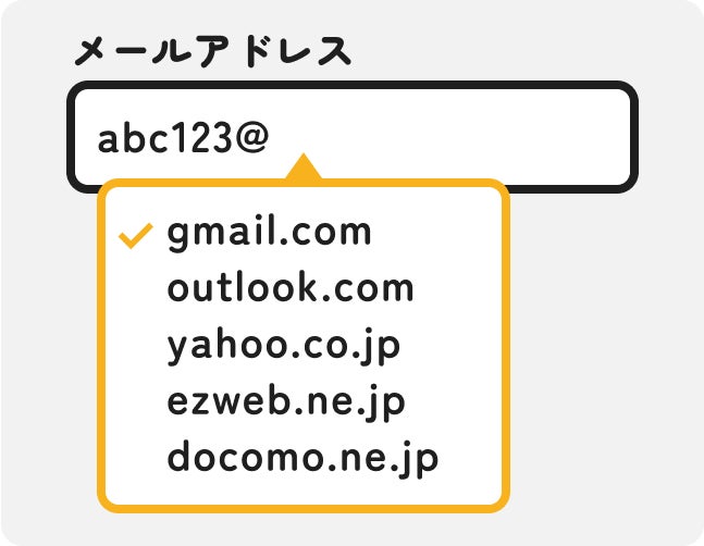 「@」入力時に gmail.com などの候補を提示し、クリックで補完可能。入力ミスを防ぎます。