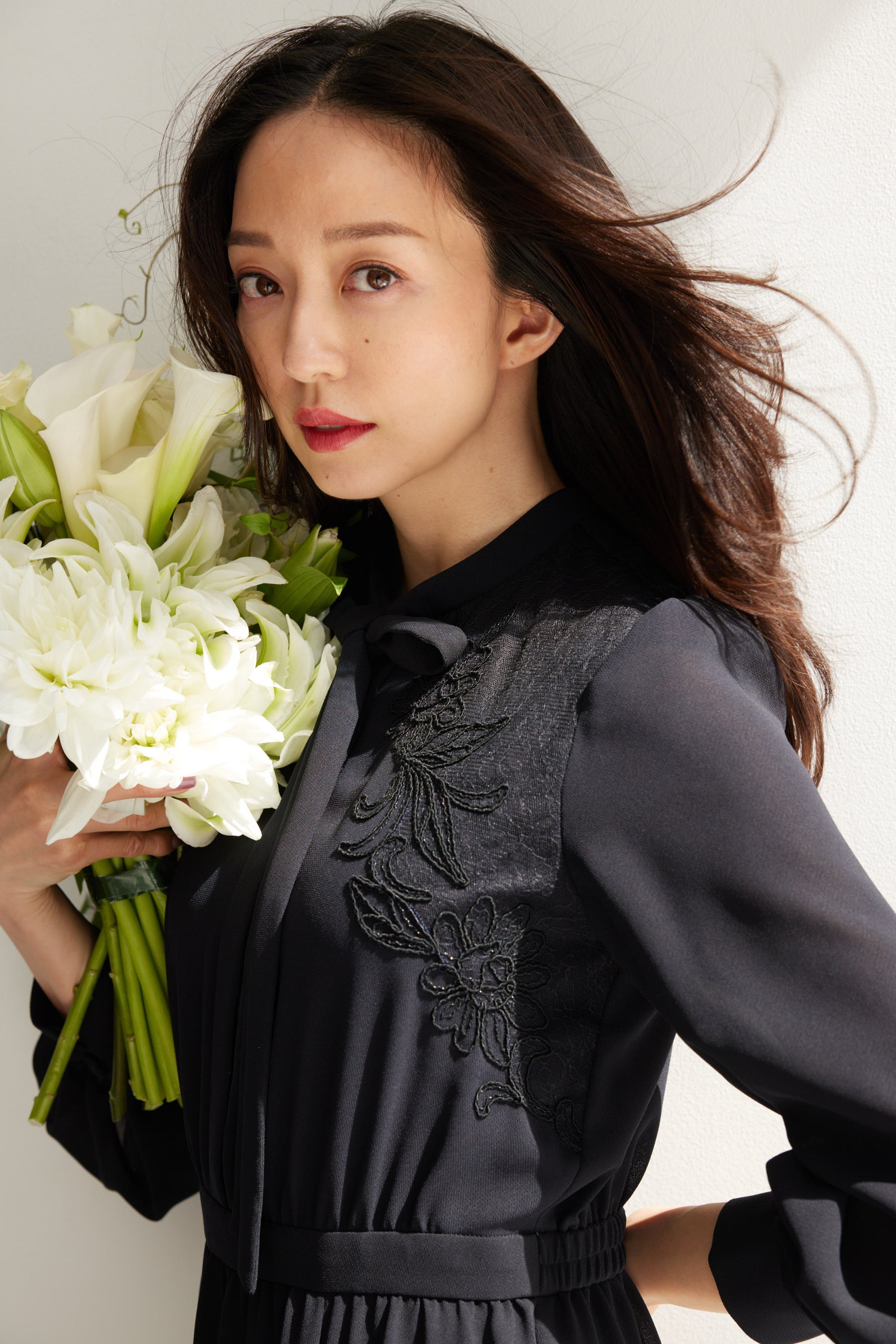 「ボウタイと刺繍、ひらめくスカート。1枚で叶う、印象的なネイビー」