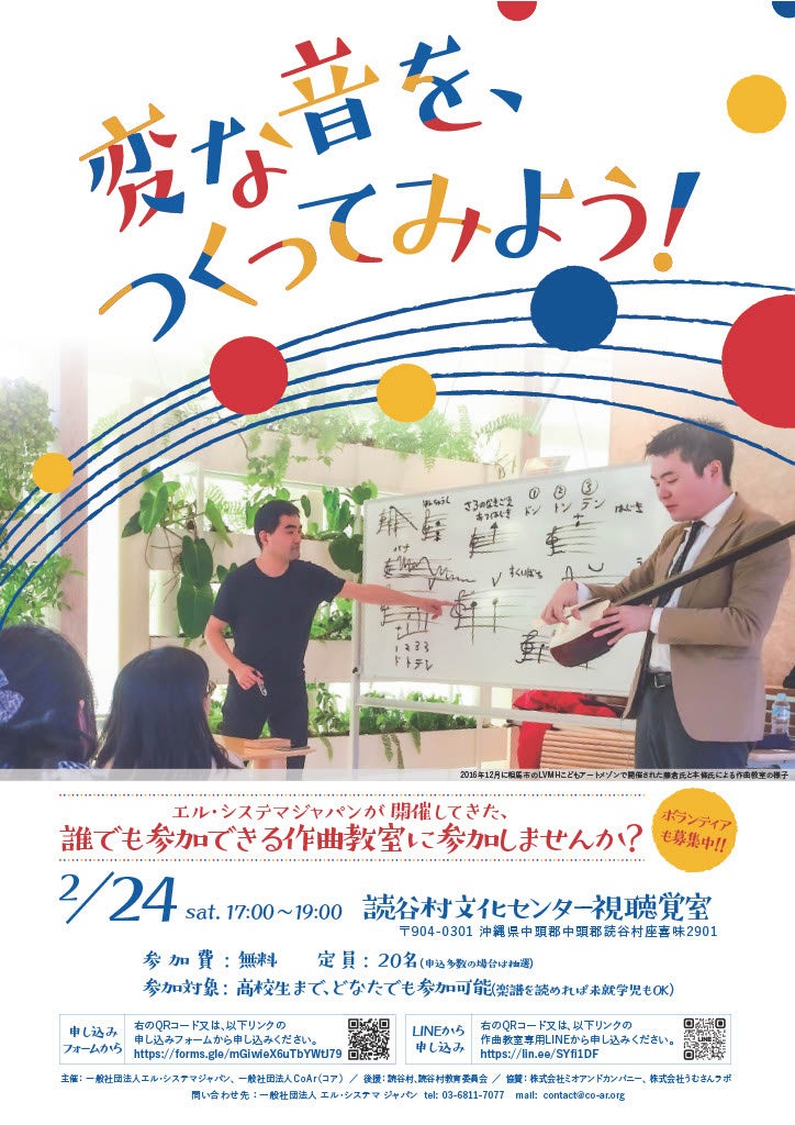 昨年、沖縄県読谷村で初めて行ったところ、キャンセル待ちが出るほどの大好評でした。そこで、今回再び「エル・システマ作曲教室」を2月24日(土)に読谷村文化センターにて、沖縄県を中心に全国で芸術文化活動を支援するCoAr(コア)と協働し、読谷村役場・読谷村教育委員会の後援で開催します。
