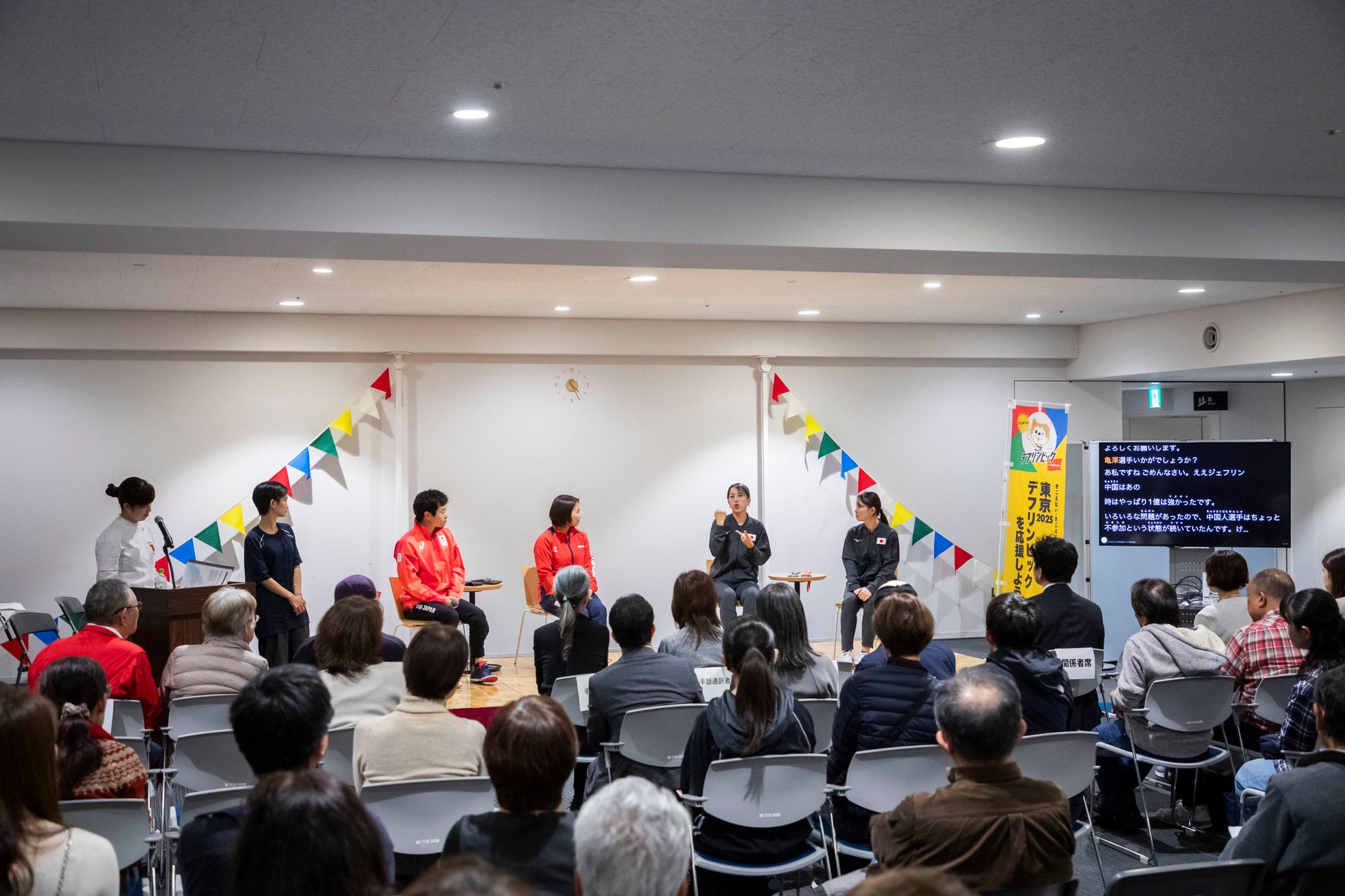 「デフ卓球体験」に引き続き、亀澤選手、山田選手、平野さん、岩渕選手にステージにご登壇いただき、みなさんの卓球との出会いや、それぞれのフィールドでの卓球の魅力、デフリンピック・オリンピック・パラリンピック、それぞれの大会についてお話をお伺いしました。