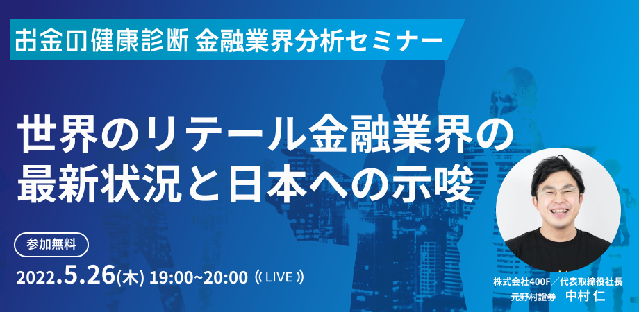 お金の相談マッチングプラットフォーム「お金の健康診断」を運営する株式会社400F(フォーハンドレッド・エフ、本社:東京都中央区、代表取締役社長:中村 仁、以下「400F」)は、2022年5月26日(木)19時より、金融業界分析セミナー「世界のリテール金融業界の最新状況と日本への示唆」をオンラインにて開催いたします。