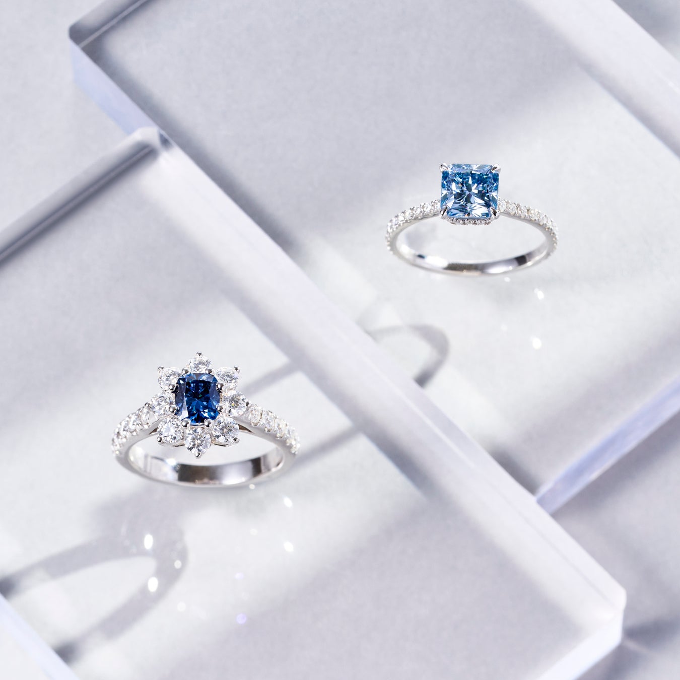 深いブルーと大きめのヘイローのコントラストが美しい華やかなリング