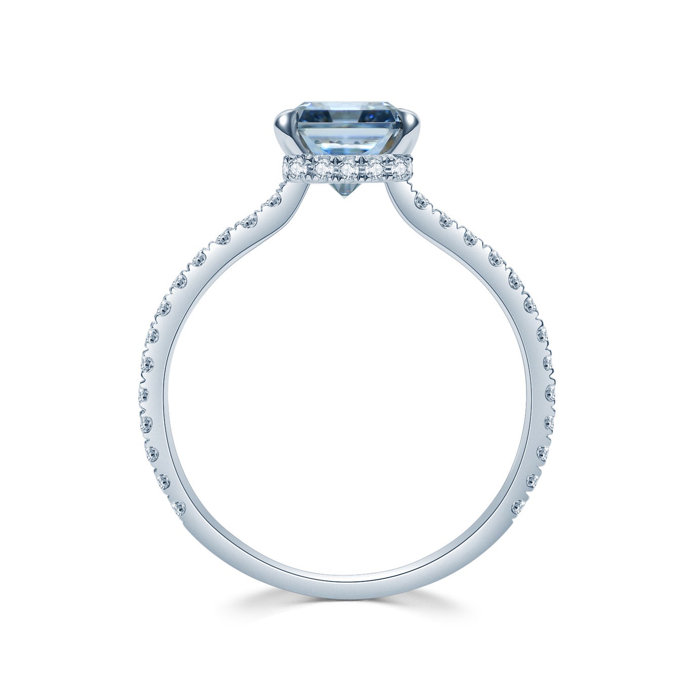 淡いブルーモアサナイトはスタイリッシュなスクエアのフォルムと煌びやかな輝きが魅力のラディアントカットで。