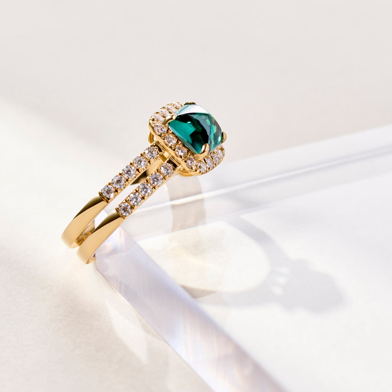 グリーンモアサナイト シュガーローフカットヘイローダブルアームリング RI487